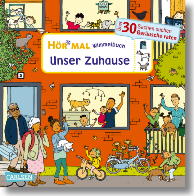 6 Wimmelbilder geben Einblicke in Flur, Küche, Wohnzimmer, Bad, Schlafzimmer und Kinderzimmer. Ein Druckknopf auf jeder Seite löst zudem eine Reihe von aufeinanderfolgenden verschiedenen Geräuschen und kurzen Redesequenzen aus.